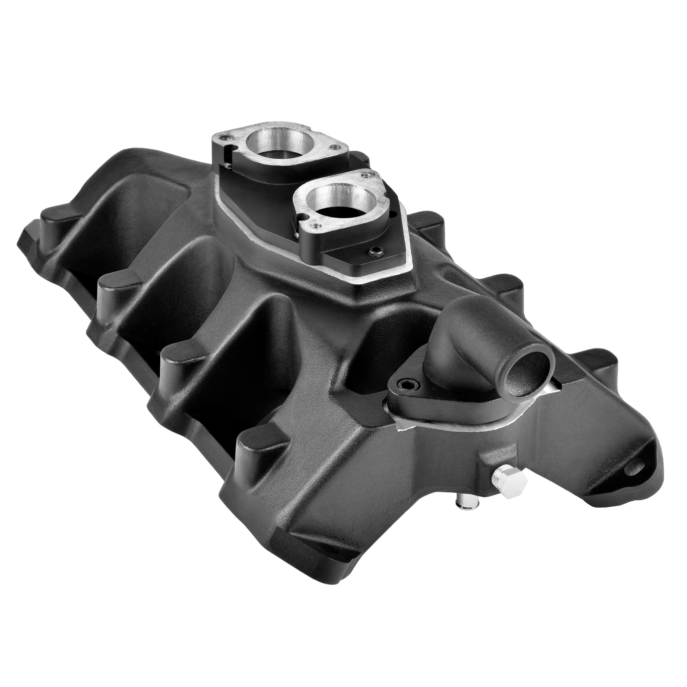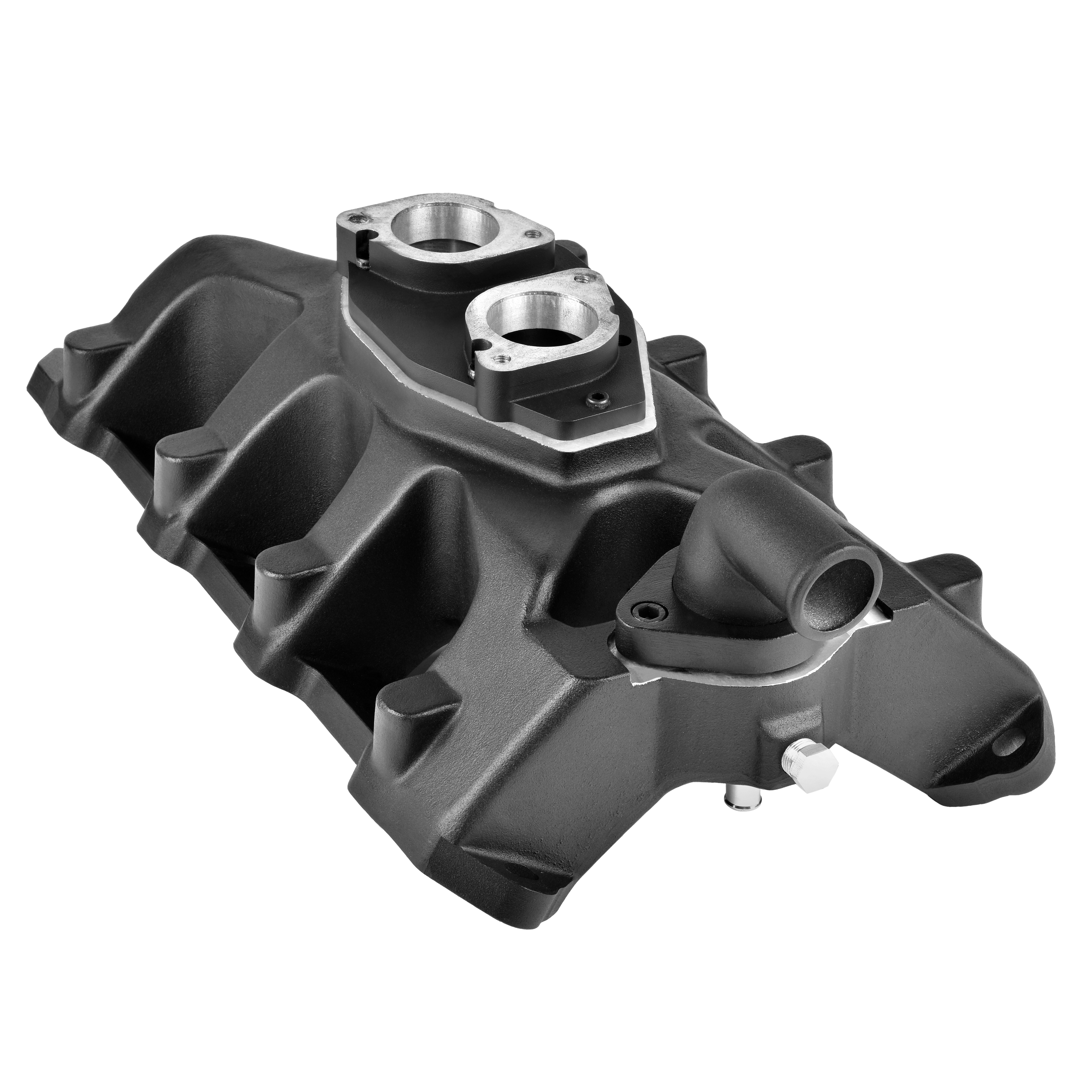 El cuerpo del múltiple incluye salientes de aluminio preparados para mecanizar, permitiendo la incorporación de inyectores para sistemas de inyección multipunto.