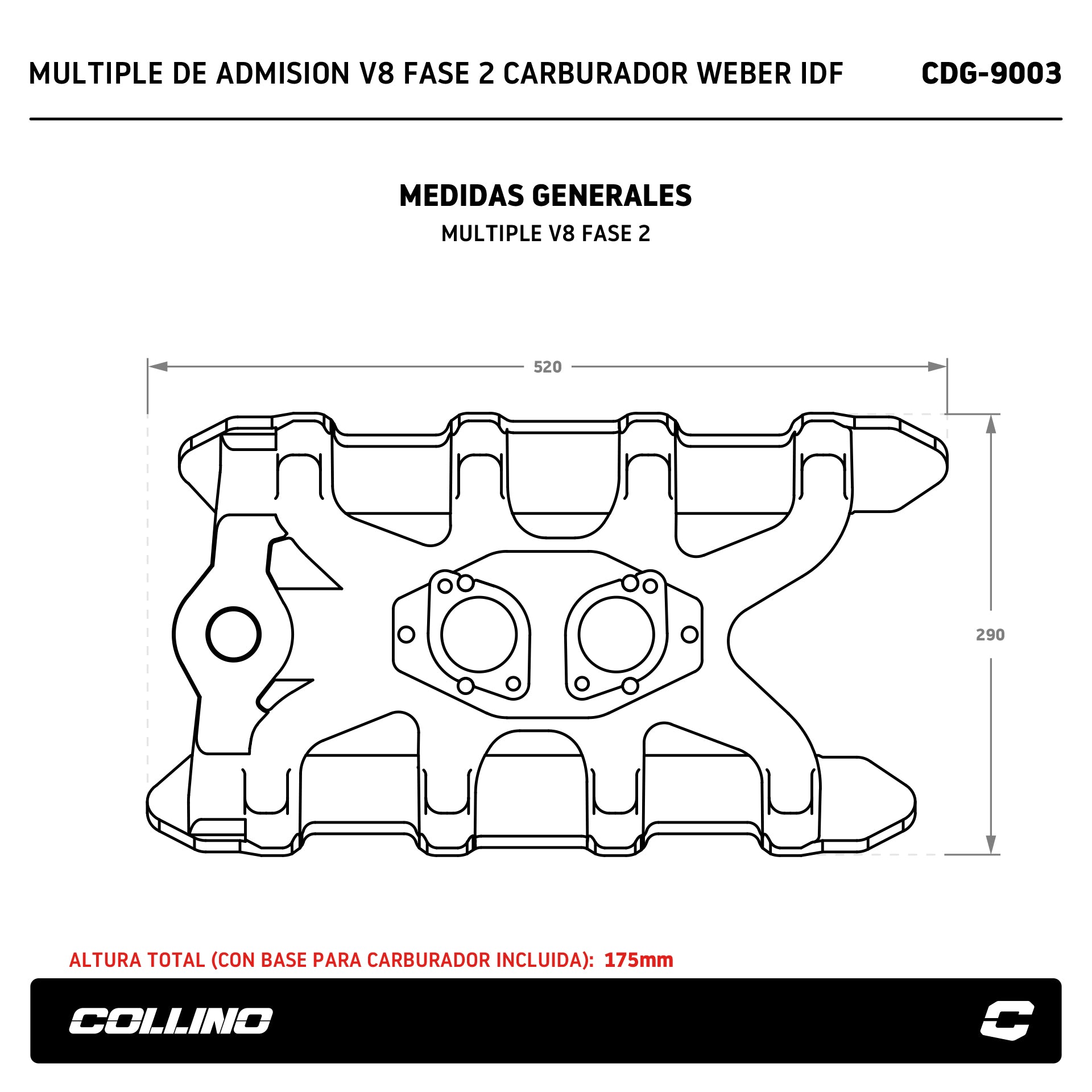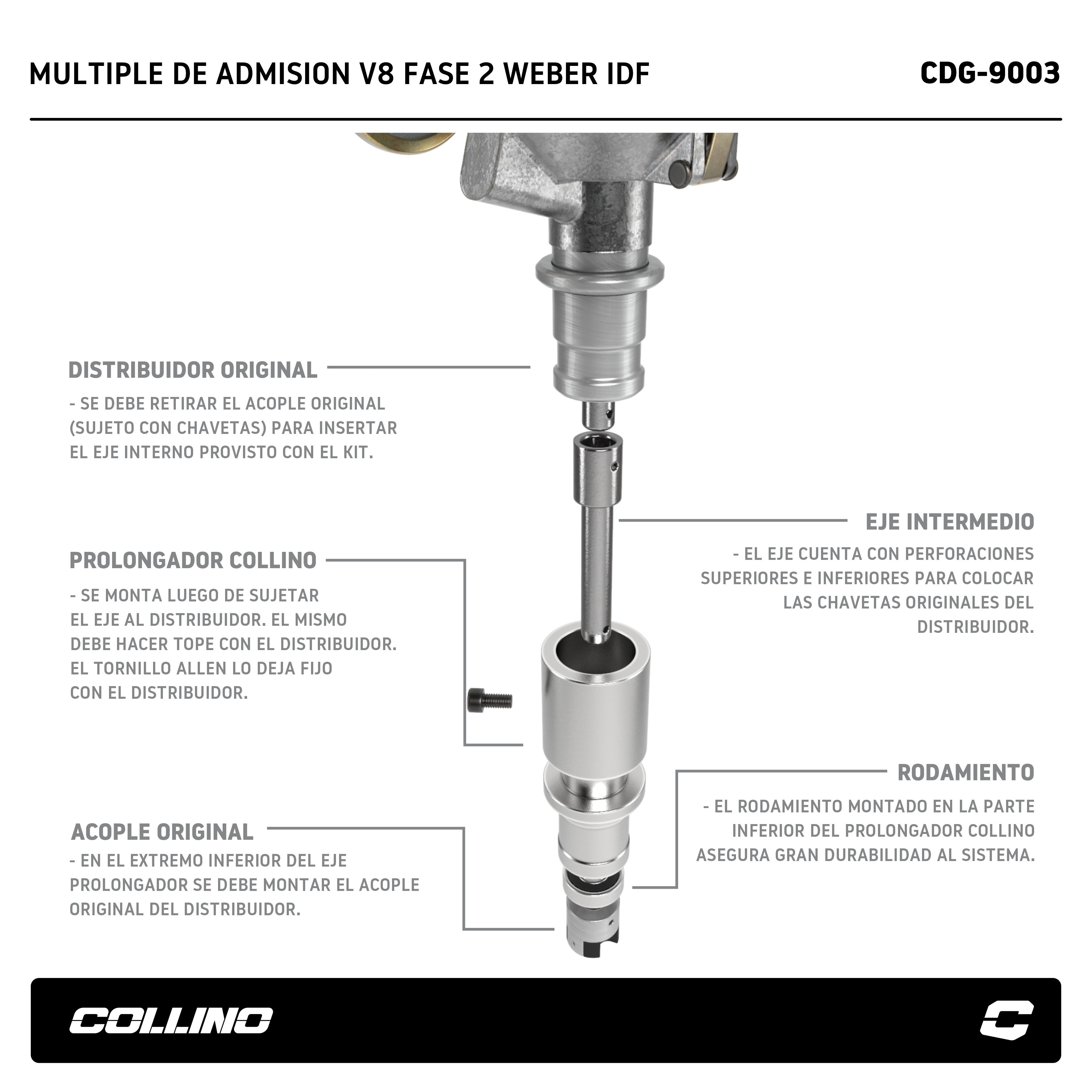 Ajustes por desgaste del motor: estos motores V8 Fase 2 tienen muchos años de uso y, en muchos casos, han sido rectificados varias veces. Las rectificaciones en tapas de cilindros o block pueden modificar el ángulo entre las tapas y el múltiple de admisión, lo que puede requerir ajustes finos específicos para cada motor, especialmente en unidades con alto kilometraje. Collino no se responsabiliza por los mecanizados que el cliente deba realizar cuando el multiple no calce en motores con mucho trabajos sobre sus planos.