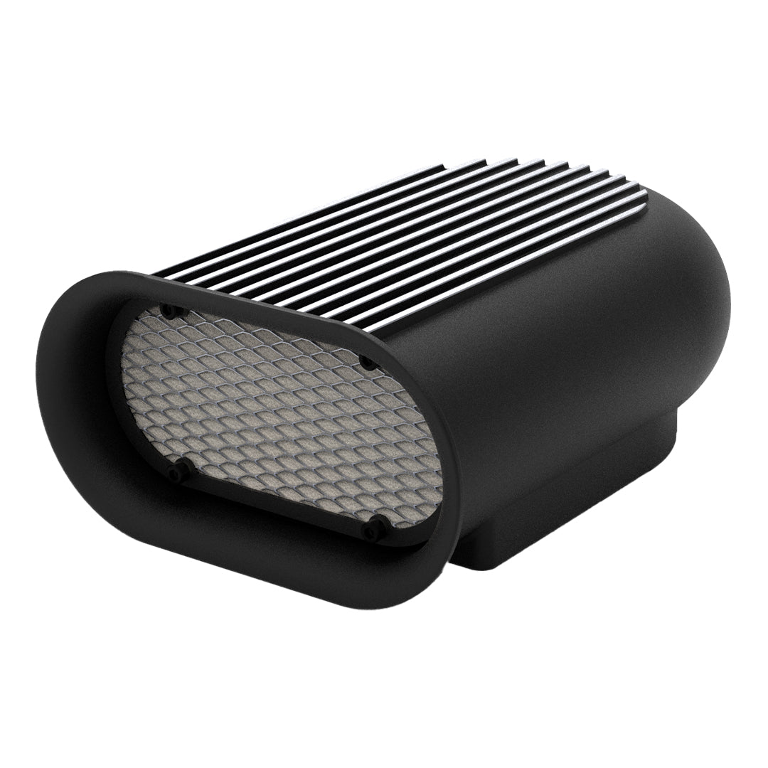 Fabricada en aluminio de alta calidad, ofrece buena rigidez estructural, durabilidad y una excelente resistencia al uso prolongado y a las condiciones del vano motor. El diseño frontal favorece una admisión directa y ordenada, contribuyendo a una correcta respiración del motor.